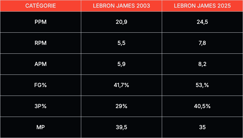 - La révolution du tir extérieur : En 2003, le shoot à trois points était la grande faiblesse du King (un médiocre 29%). En 2025, il est devenu une menace d'élite derrière l'arc, dépassant régulièrement les 40% de réussite. Cette mutation lui a permis d'économiser son corps en évitant les contacts systématiques dans la raquette.
